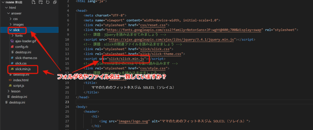 読み込み用のタグに記述のフォルダ名やファイル名と、実際のフォルダ名・ファイル名は一致していますか?