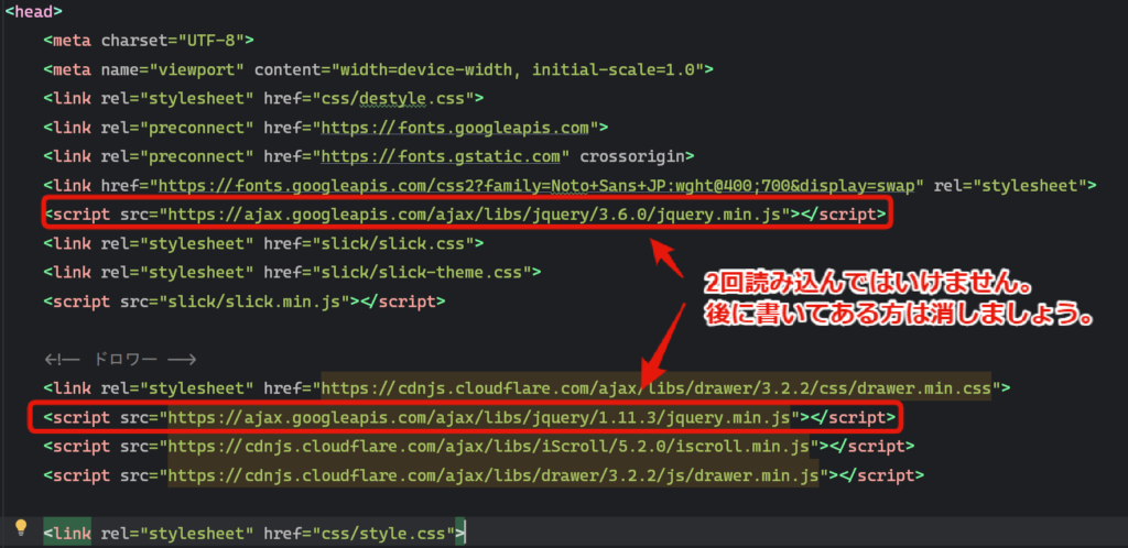 複数回読み込んでいる場合には、最初の一つだけ残して2つめ以降のものは削除しましょう。